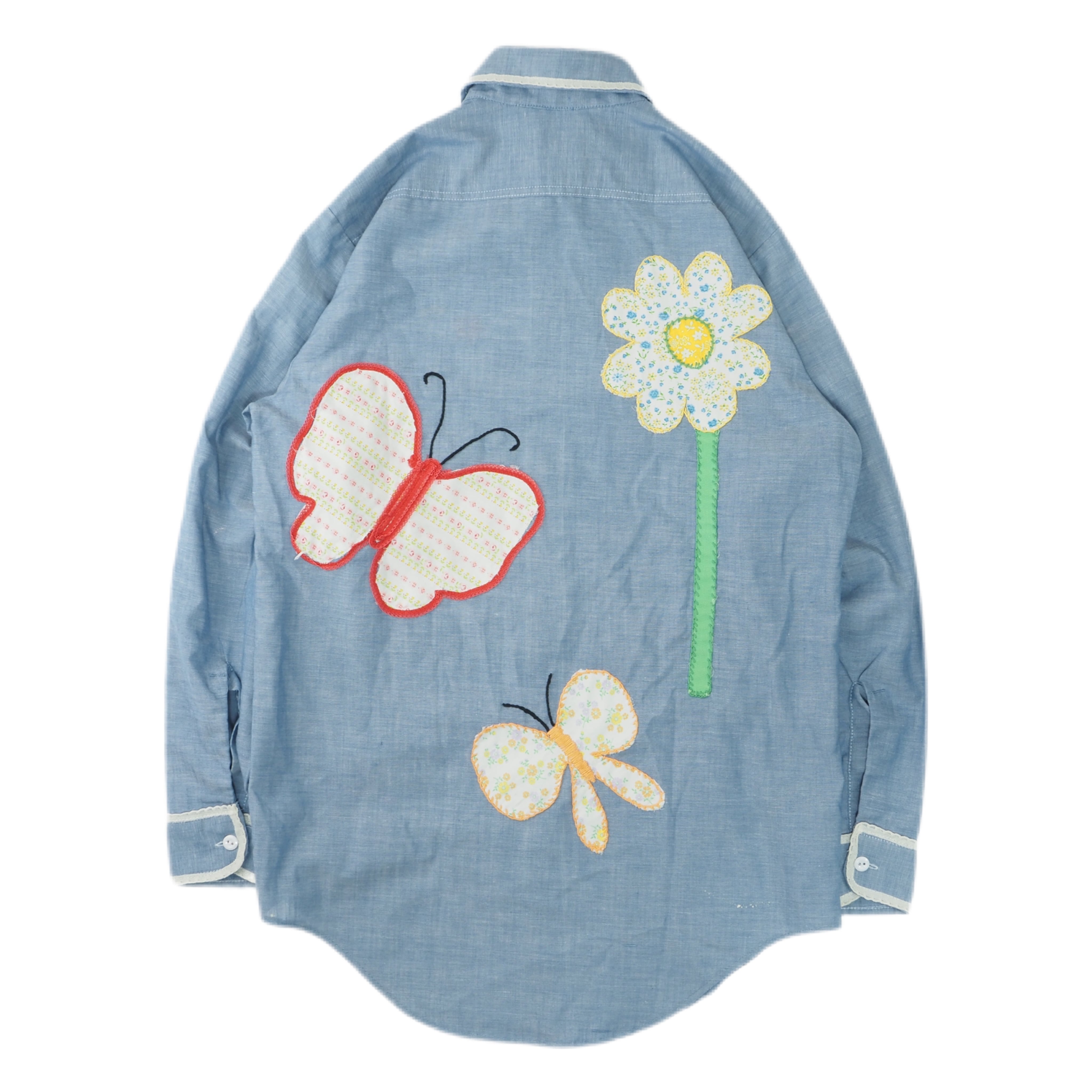 70年代ビックマックのシャンブレーシャツです。蝶と花の刺繍パッチがあしらわれた、可愛らしいデザインの1着。ビックマックの刺繍入りシャンブレーは人気な印象です。デザインがものによって違うので、一点物感もたまらないアイテム。気に入るデザインがあれば即買いをおすすめしたいアイテムですね。ファブリックはポリエステル混紡の柔らかい生地感で、普段Mサイズを着る人でジャストなサイズ感です。