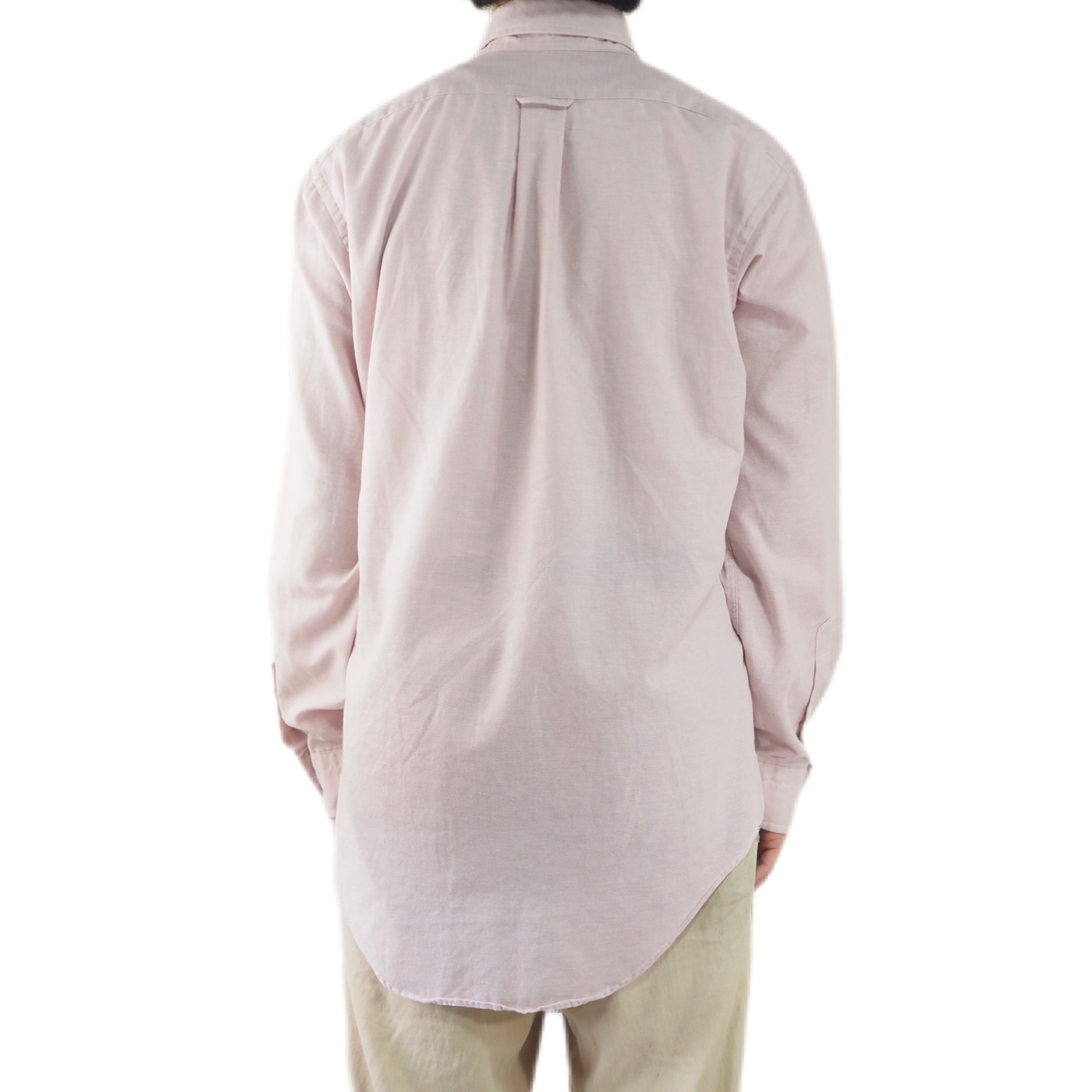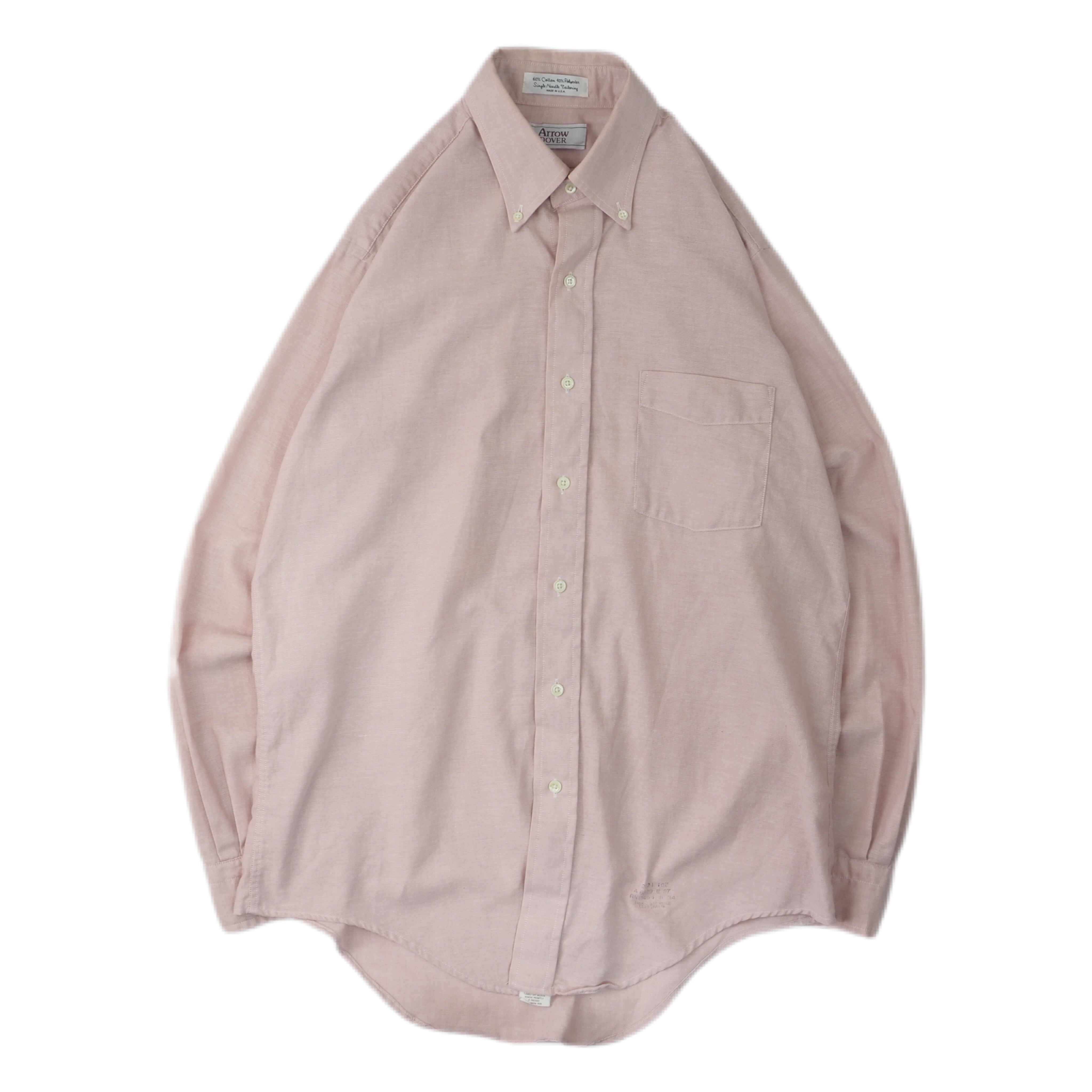 80年代Arrowのボタンダウンシャツです。ヴィンテージシャツでお馴染みのArrow。淡いピンクの柔らかな色合いが上品で、ボタンダウンカラーのクラシックなデザインが魅力的なシャツ。ファブリックはポリエステル混紡で、程よく柔らかい生地感。シングルニードル縫製による上品さもありながら、カジュアルシャツらしいパッチポケットが良いアクセント。裾はラウンドしており、タックインにも適したアイテム。カジュアルにもキレイめにも使える万能アイテムです。