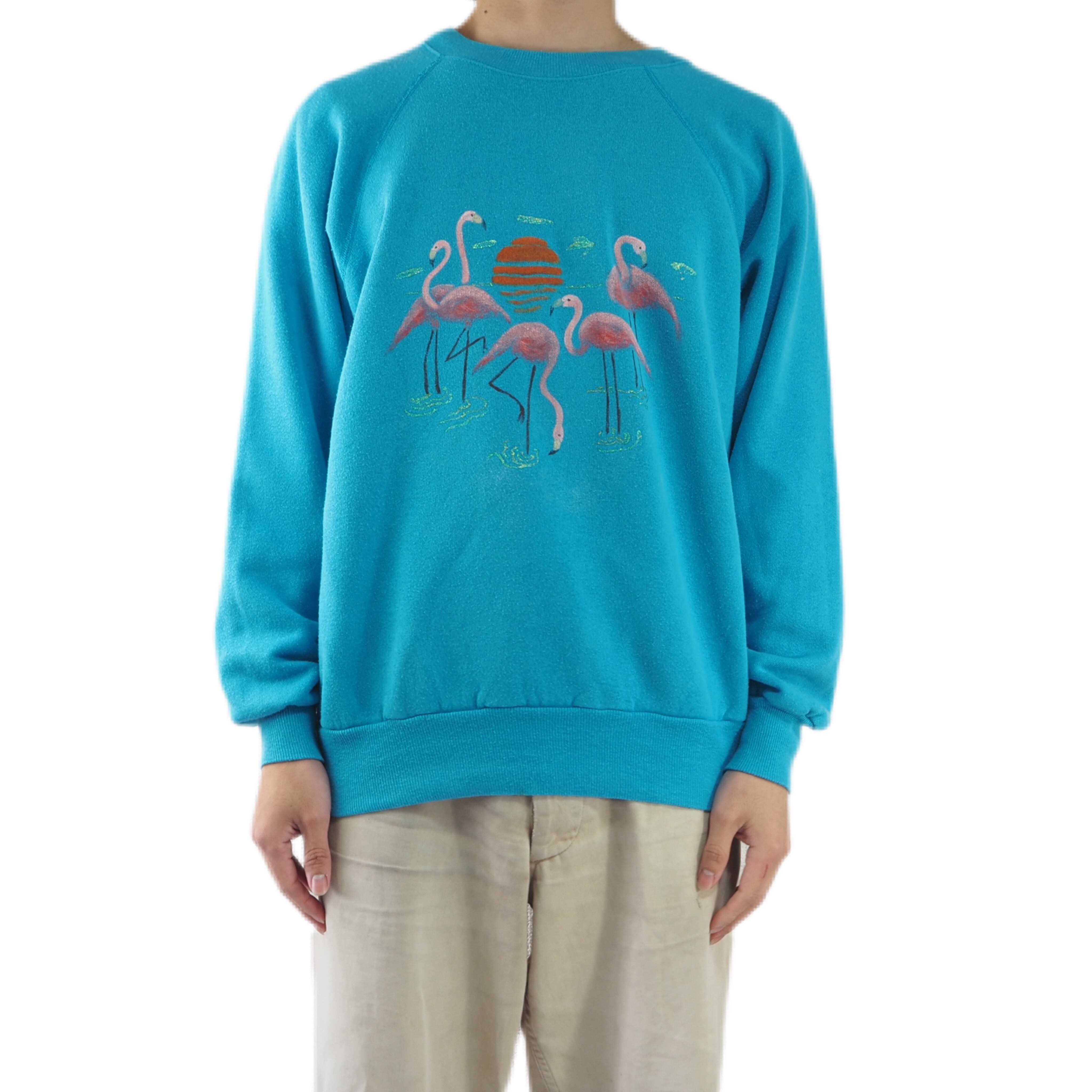80年代のアートプリントスウエットです。鮮やかなターコイズブルーが目を引くスウェット。フロントには夕焼けの背景にフラミンゴが描かれた、アート感のあるプリントが特徴的。80年代らしいポリエステル混紡の柔らかなファブリックで、ラグランスリーブ仕様で動きやすいのもポイント。このプリントがなかなか出ないらしく、コレクターアイテムとしてもオススメです。サイズ感は普段Mサイズを着る自分でちょうどよく着れました。
