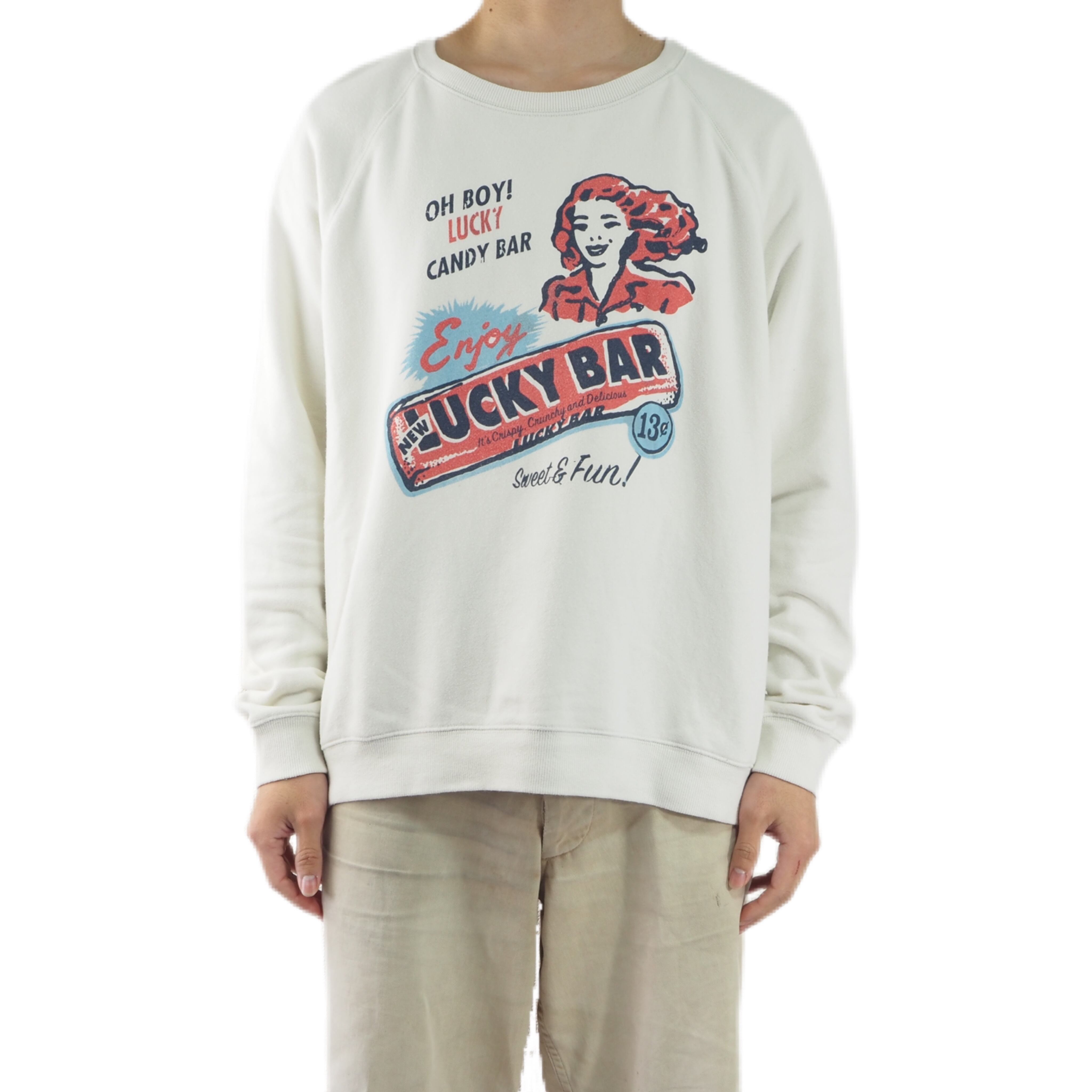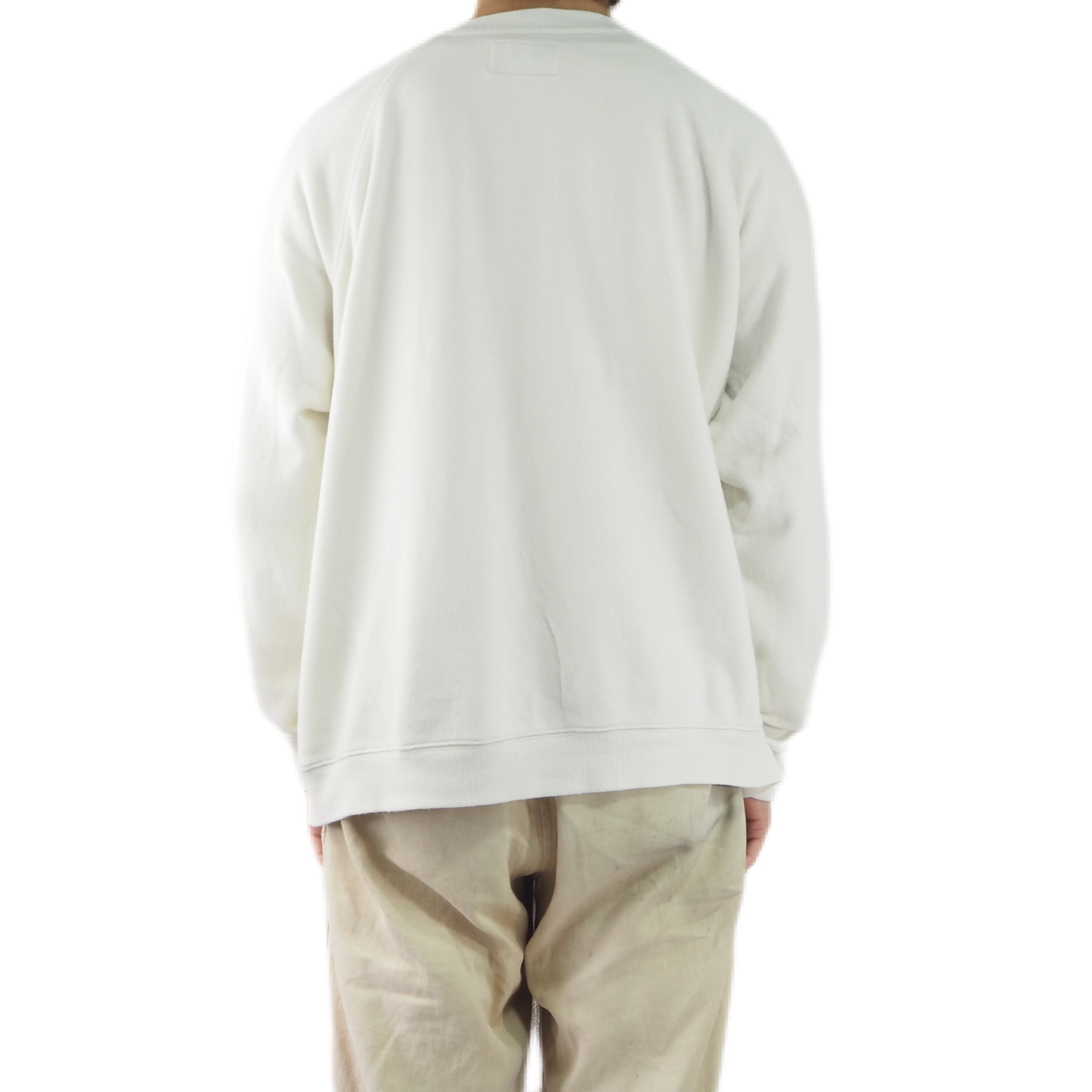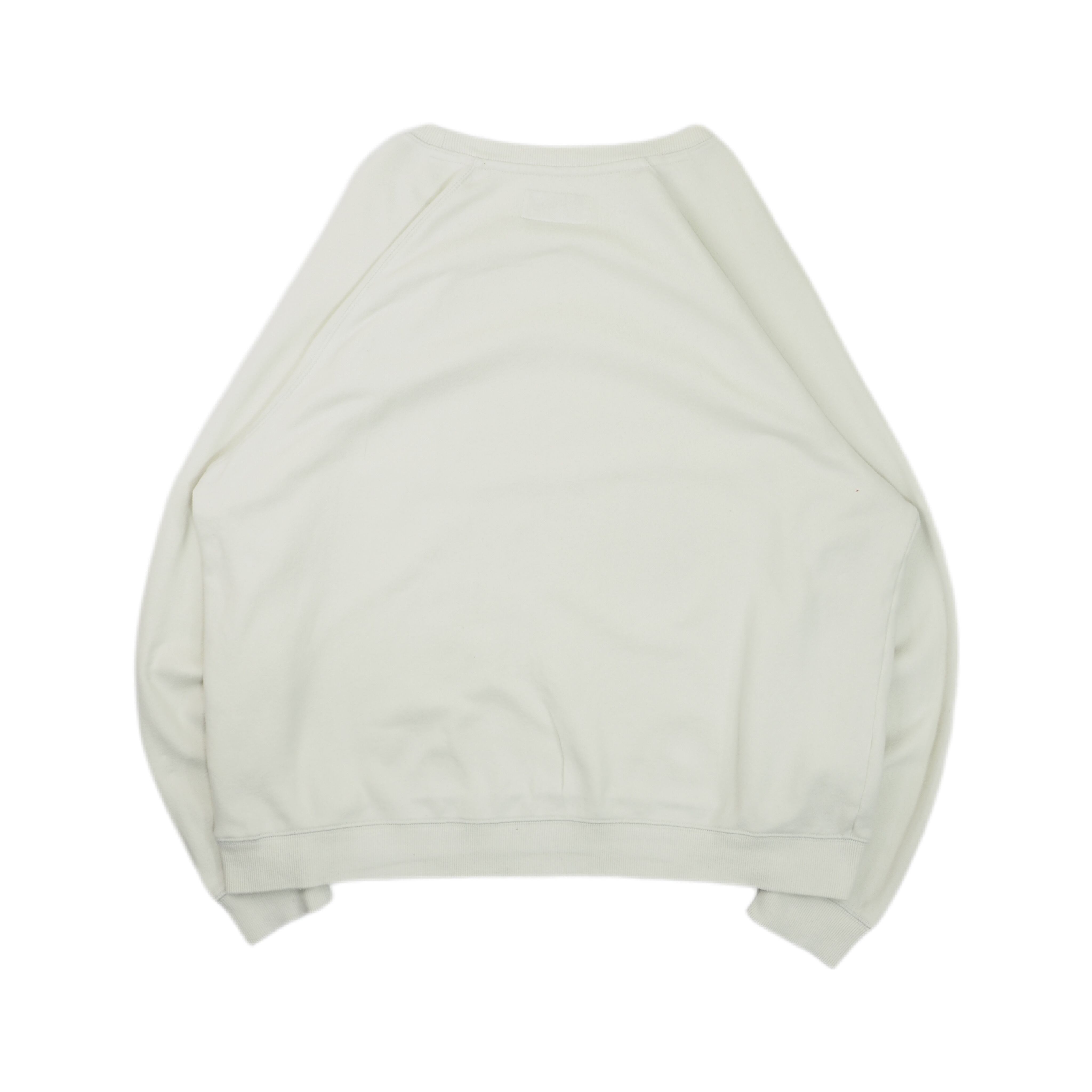 広告風のグラフィックが特徴的な1着。レトロなフォントとイラストが、ポップで懐かしい雰囲気。ミルクベージュのような色合いで、合わせやすい1着。ラグランスリーブで動きやすく、身幅広めの短丈シルエット。カジュアルなデニムやスニーカーと合わせて、レトロポップなスタイルができるのではないでしょうか。サイズ感は、普段Mサイズを着用する自分で少しゆったり目に着用できました。