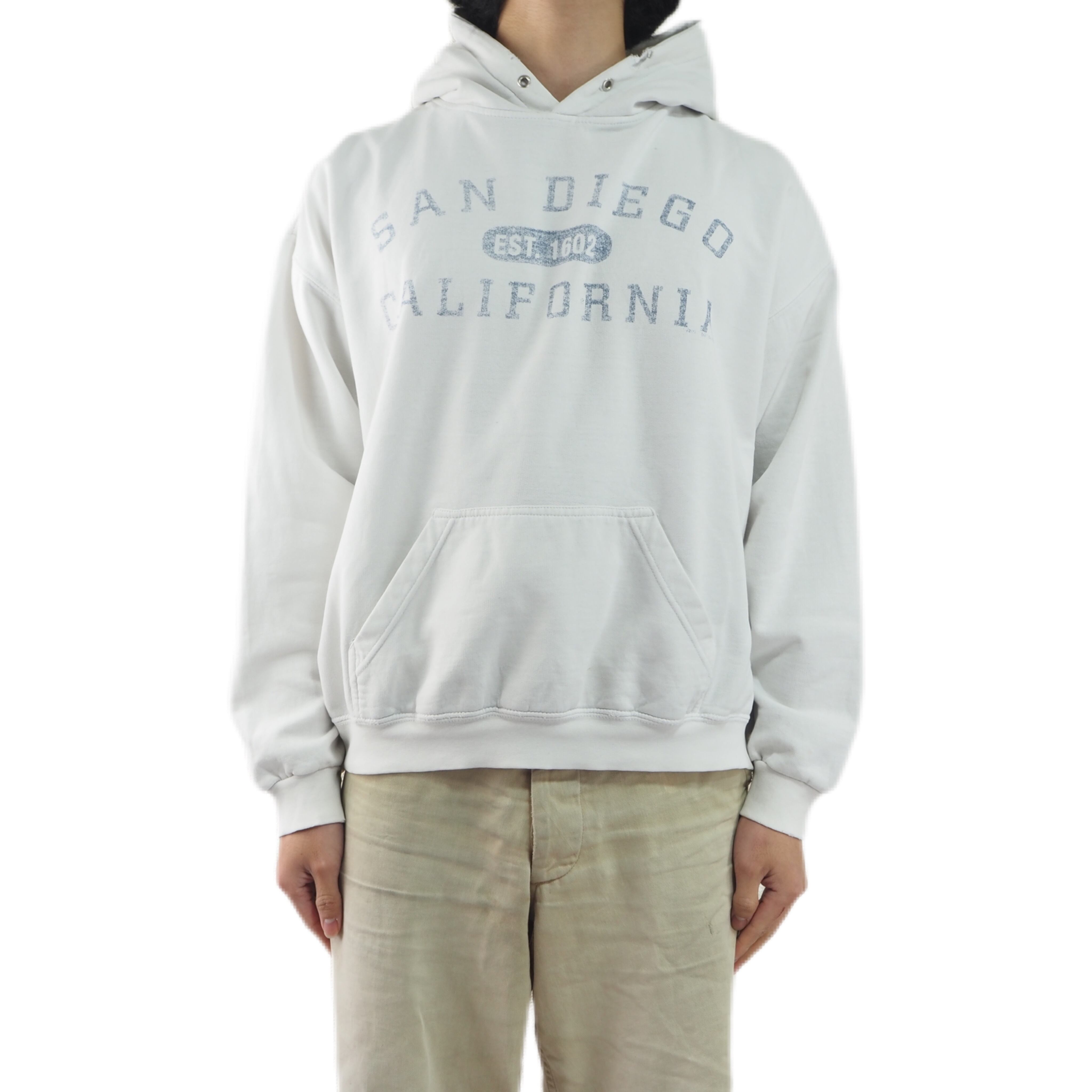カレッジロゴフーディスウェットです。ノーブランドだからって侮ったらいけないやつ。タフな生地感のスウェットで、特徴的なのはなんと言ってもシルエット。身幅広めの短丈シルエットで、理想的な形をしています。ヴィンテージのラッセルみたいなシルエットです。サイズ感は普段Mサイズを着る私でちょうどよく着れました。肩幅、身幅が広いので普段Lサイズを着用する人でも着用できそうですね。