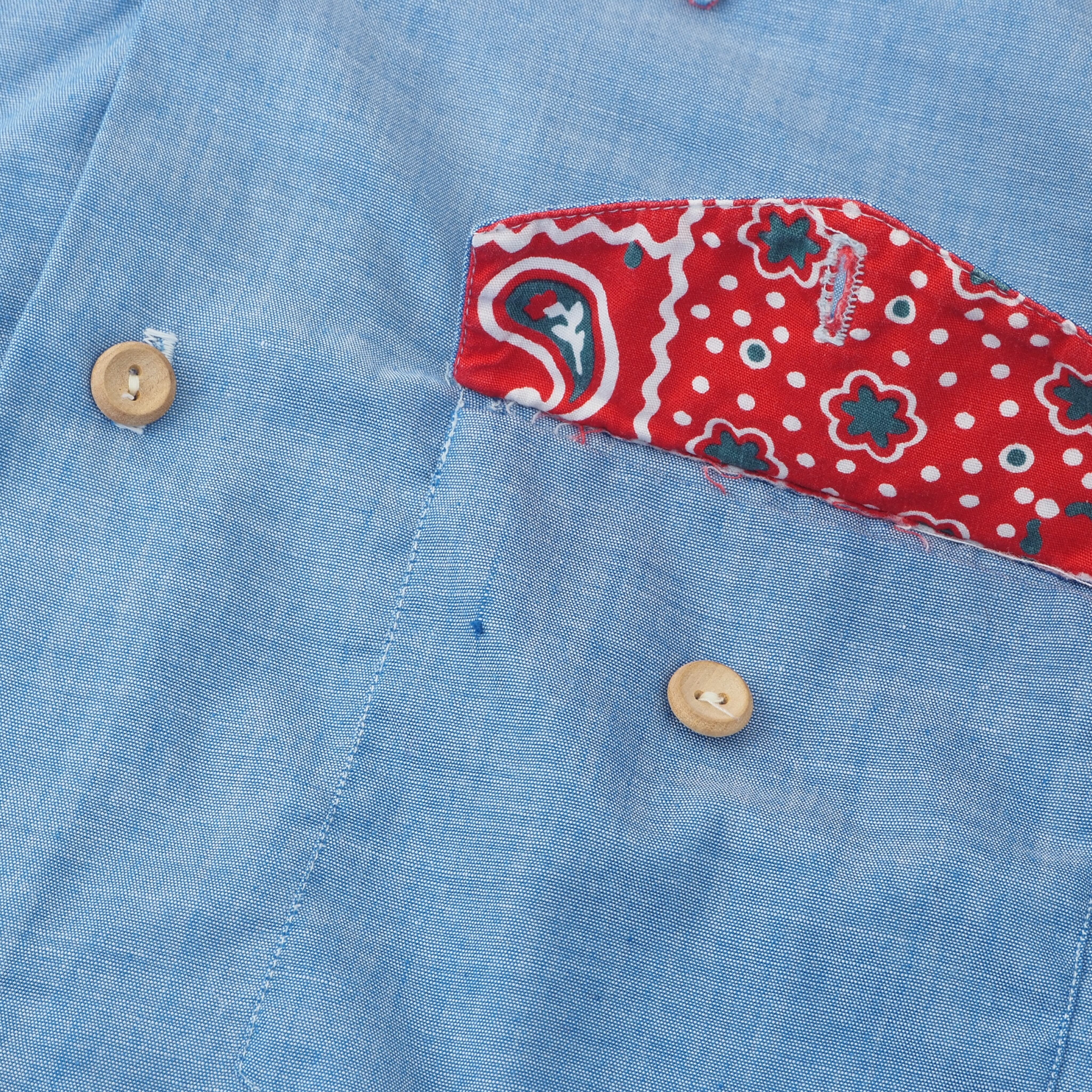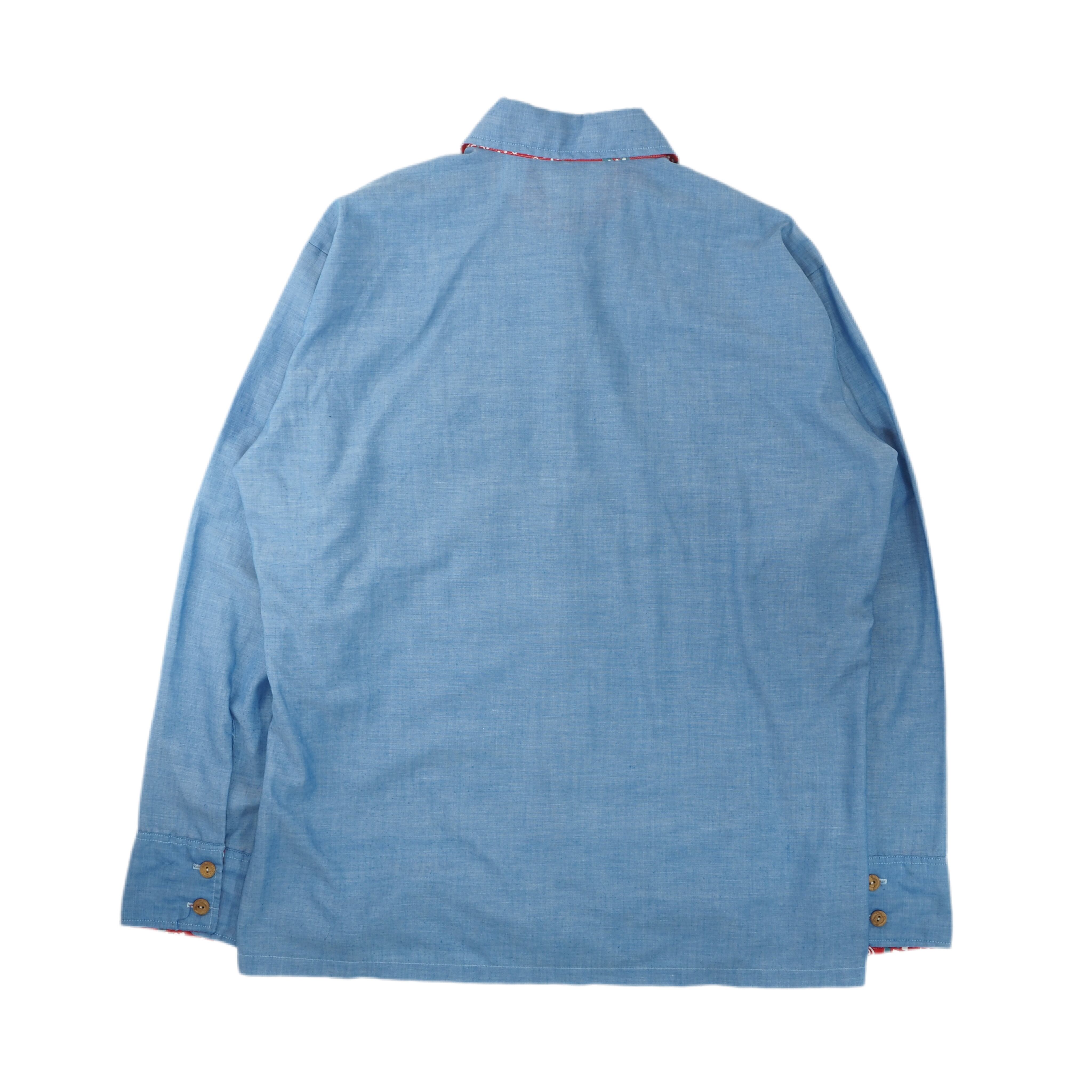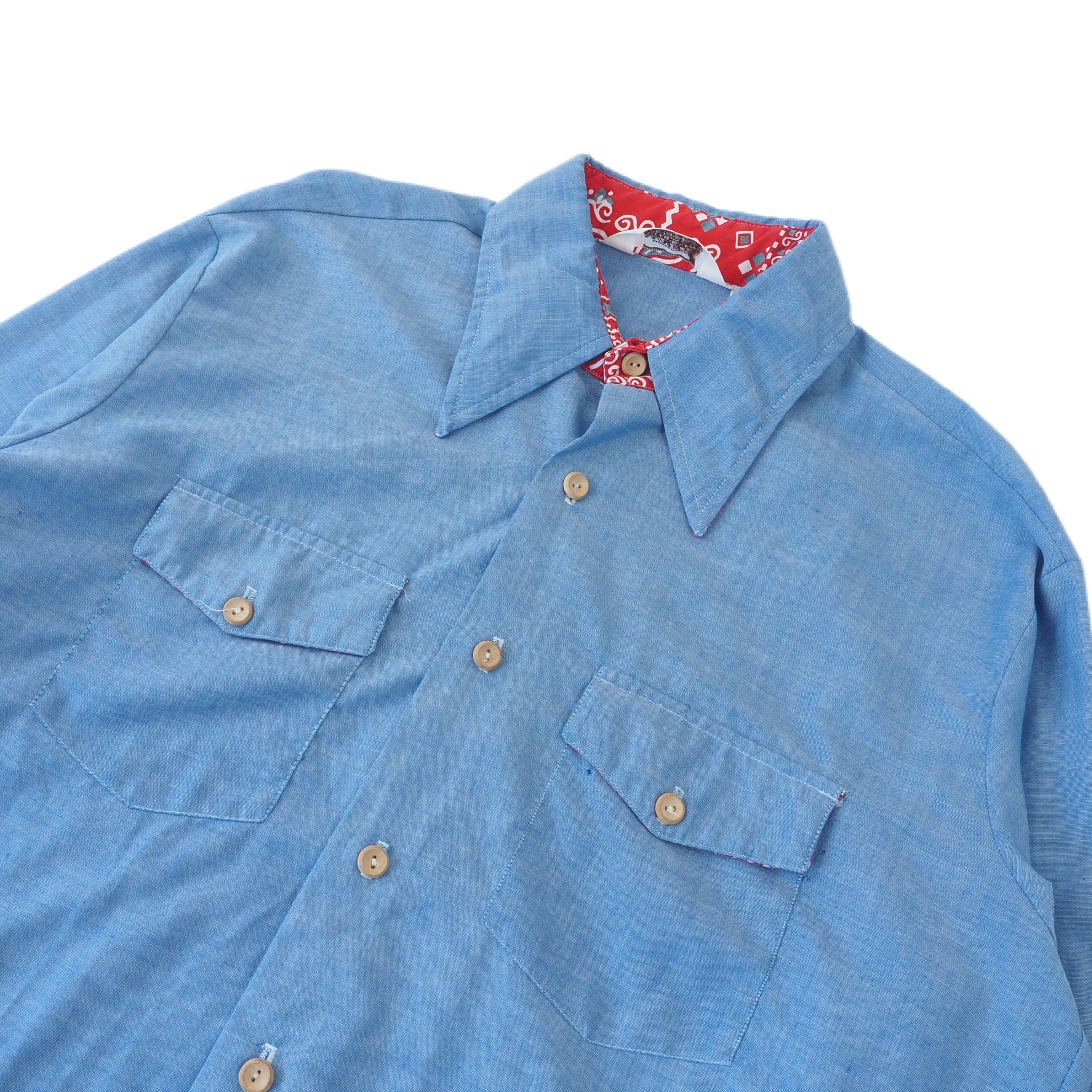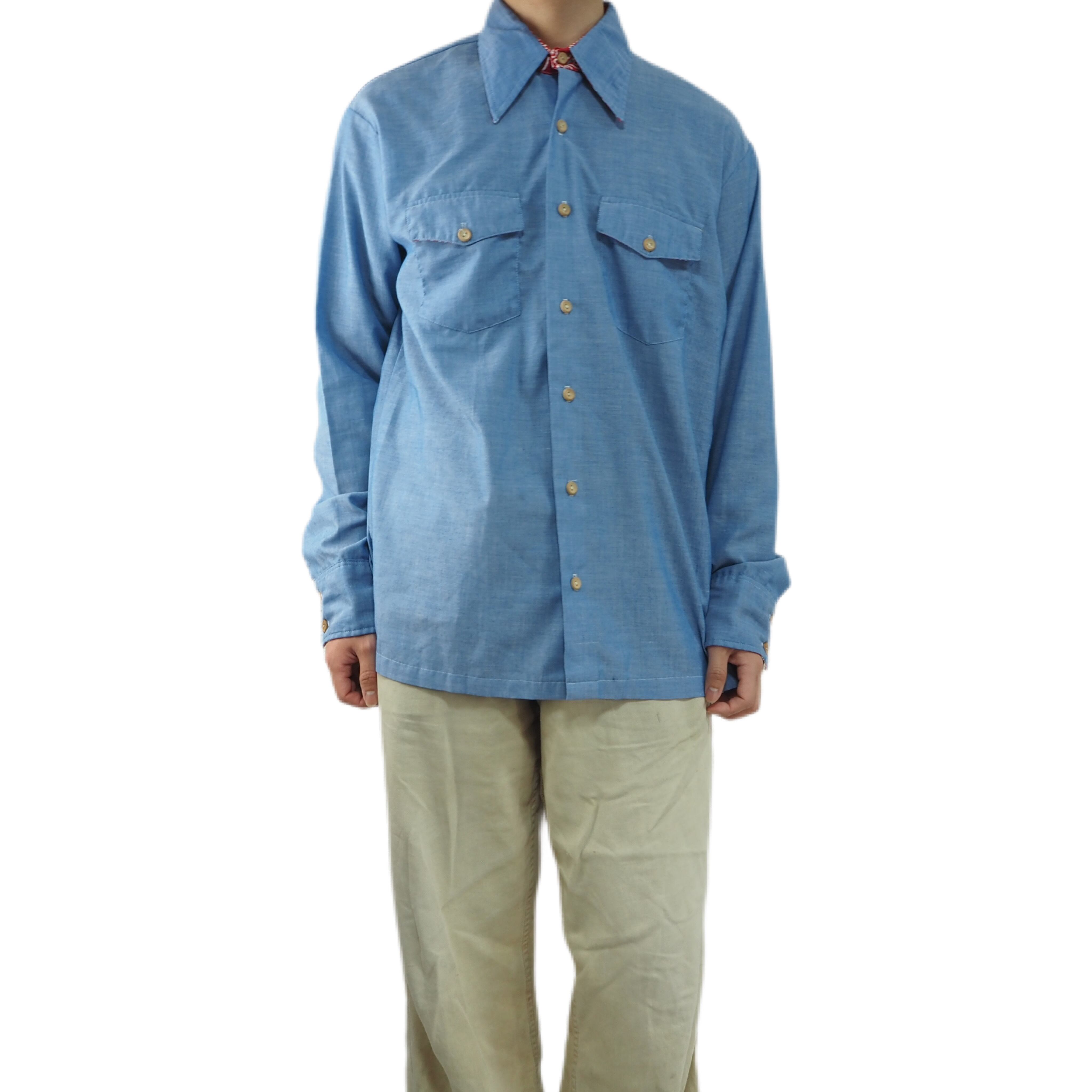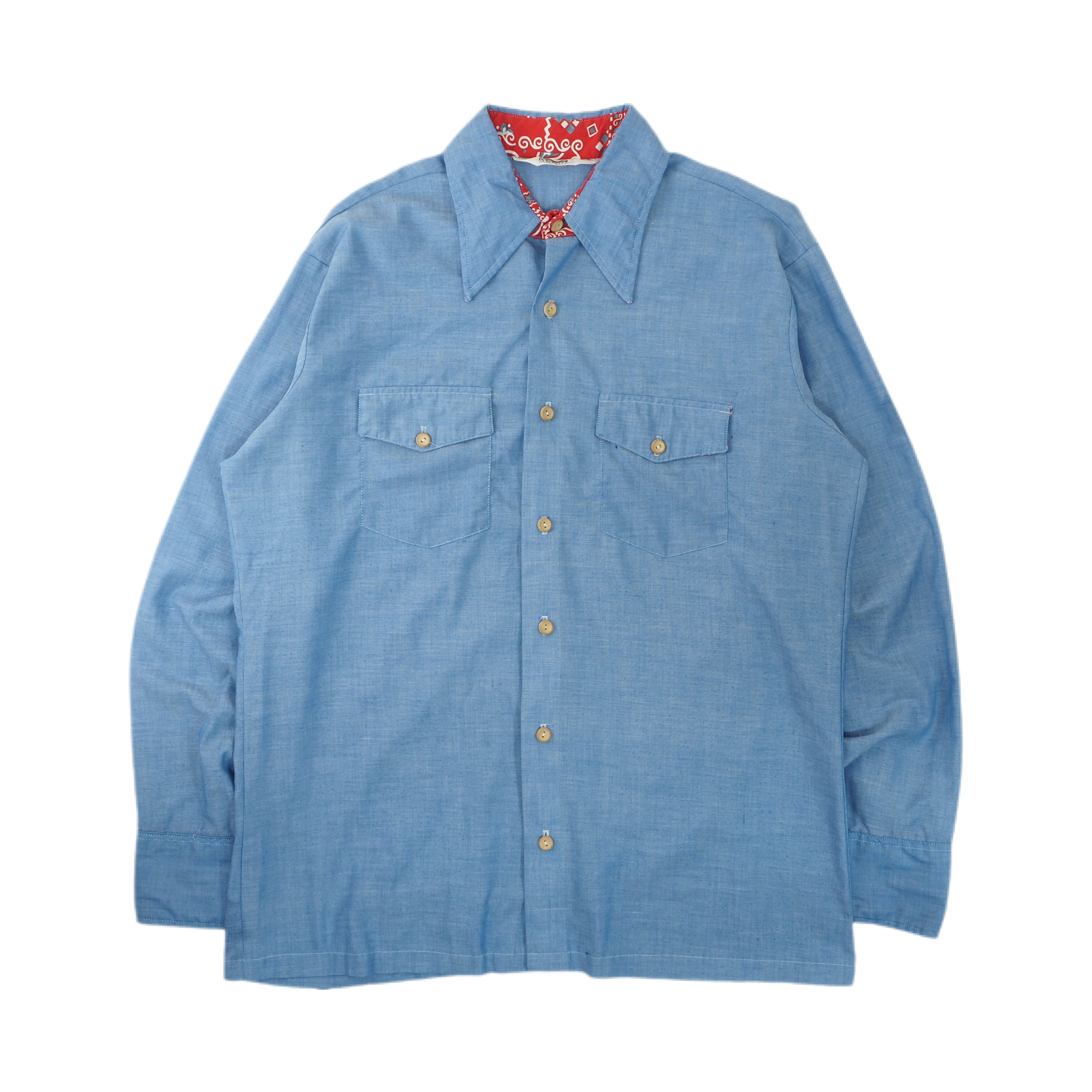 1970年代Montgomery Ward(モンゴメリーワード)製のシャツ。アメカジ好きなら知らない人はいないであろう三大ストアブランドの1つ。ヴィンテージ市場でも高い評価を受けているブランド。ライトブルーのカラーリングに、襟やカフス、フラップ裏のバンダナ柄の切り替えが施された個性的なデザイン。さらに木製ボタン、70年代らしい鋭くとがった襟が特徴的。所々のディテールは個性がありますが、派手すぎず、程よく個性を主張できるのが魅力。